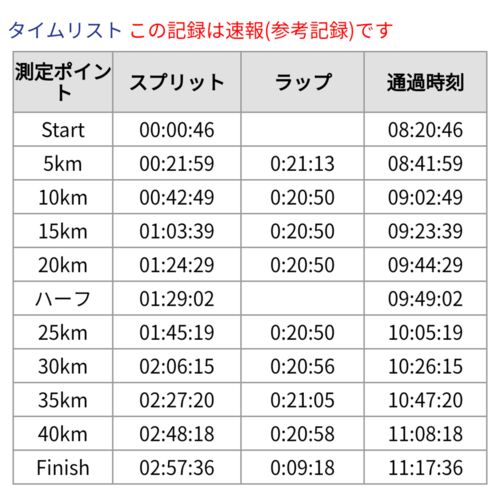 みなさま、一昨日はたくさんの☆やコメント、有難うございました!実感が湧いてきたというか何というか。改めてラップを見てにんまりしたり。。ちなみにグロスのタイムを見ていてネガティブスプリットだったのかなと思ってましたが、前半ハーフ:1:28:16 後半…